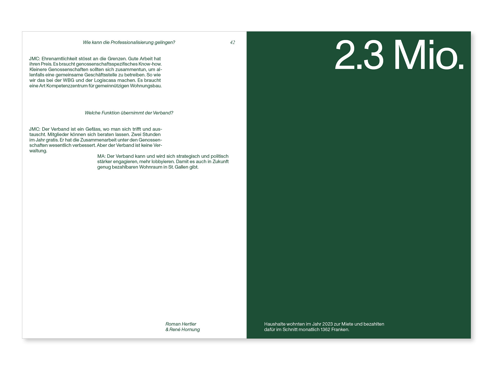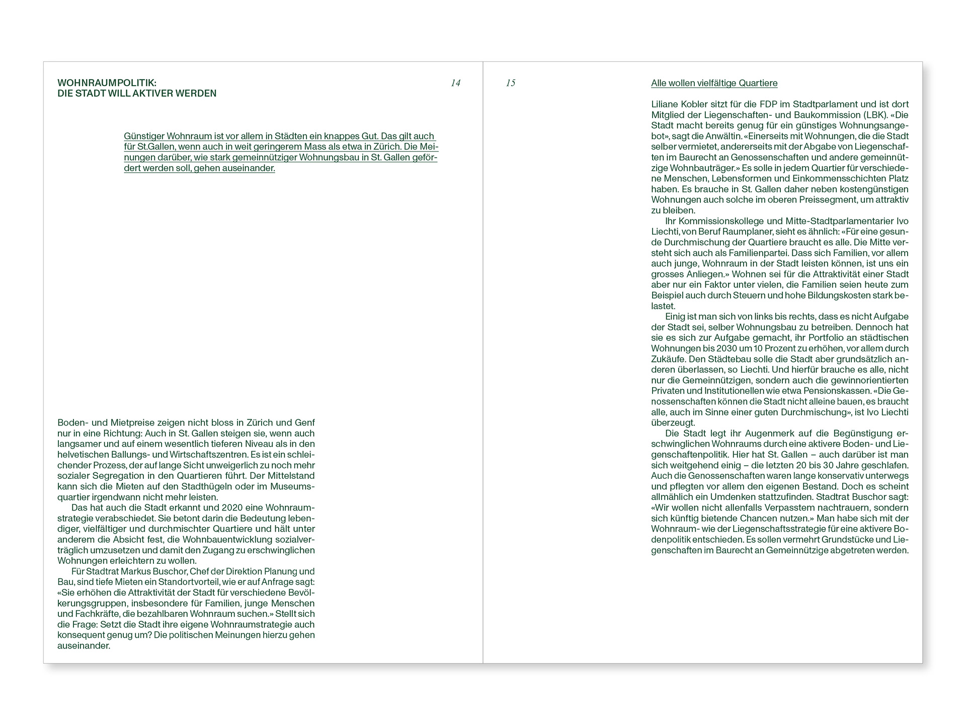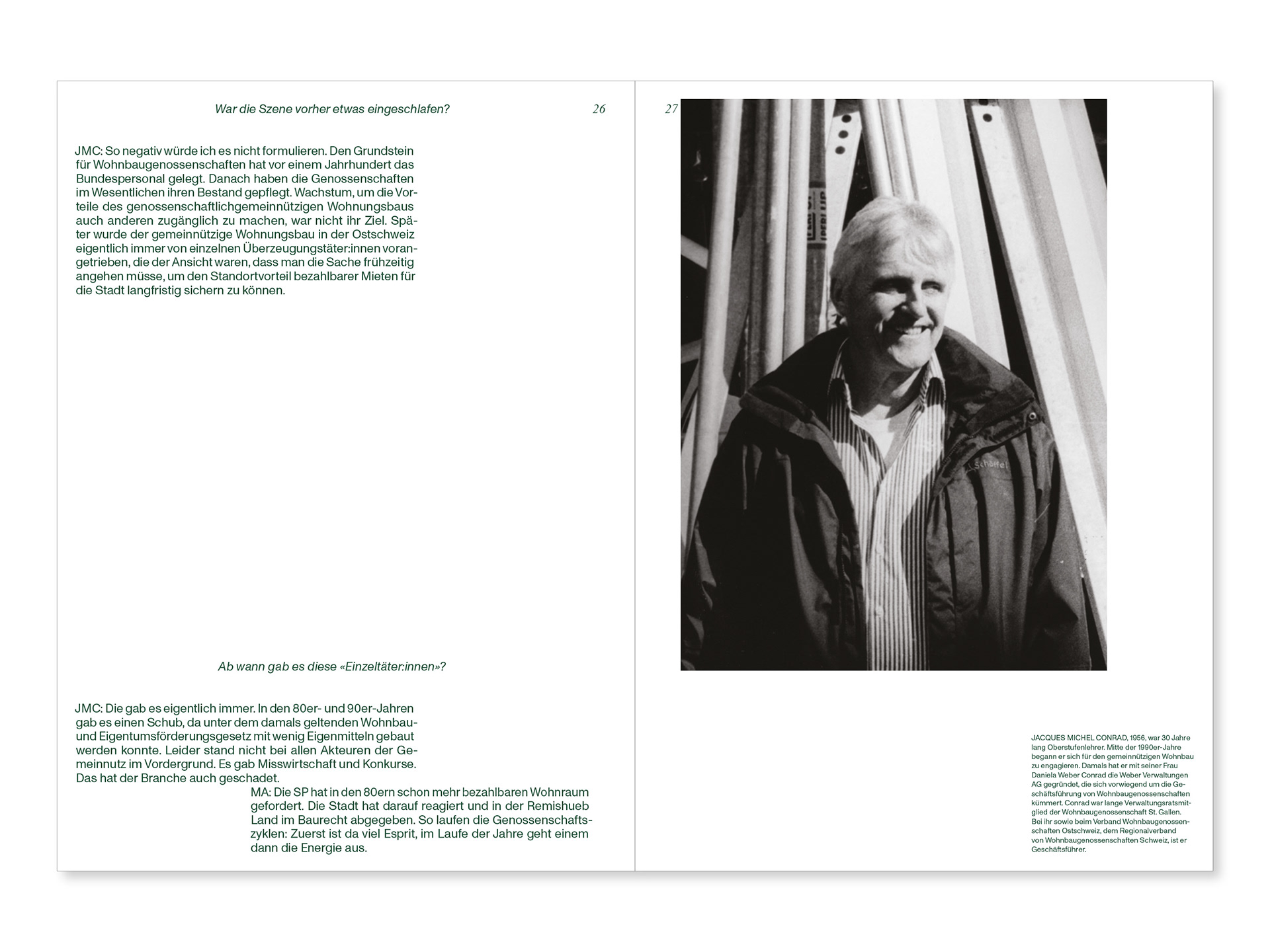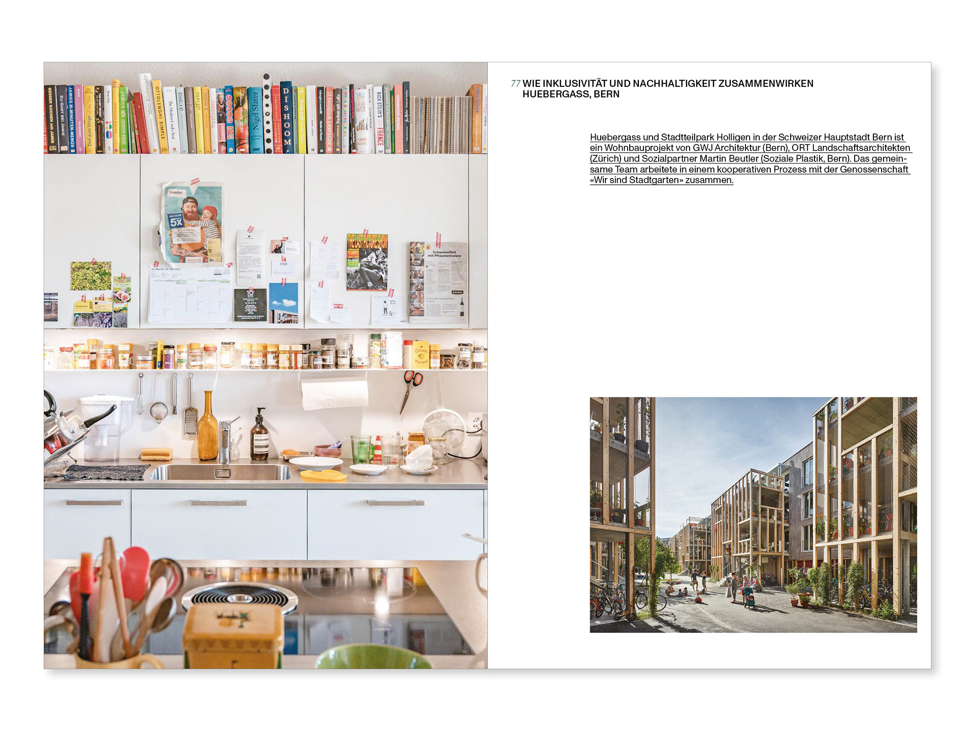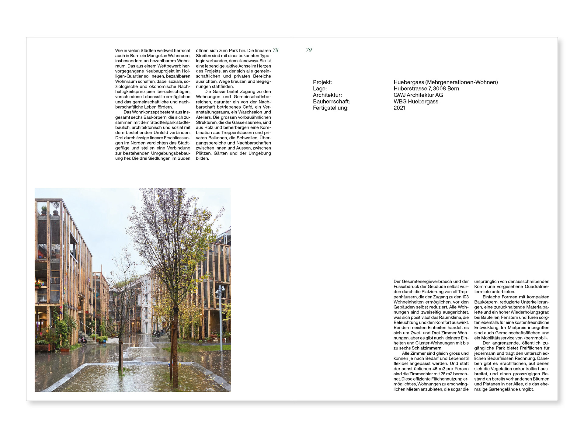 Als Gestaltungskonzept habe ich die Anordnung eines Wohnungsgrundrisses im Format übersetzt. Texte erscheinen als Blöcke und sind mit wenig Randabstand in die Ecken gestellt. Sie sind jeweils über vier Spalten laufend, Abweichungen sind Titel und Lead. Auch Bilder werden an den Rändern ausgerichtet, sie sind fünf Spalten breit oder erscheinen vollflächig. Die Beiden abschnitte im Buch (Essays und Beispielprojekte) werden gestalterisch subtil voneinander unterschieden, in Spaltenbreite, Schriftgrösse und -farbe.